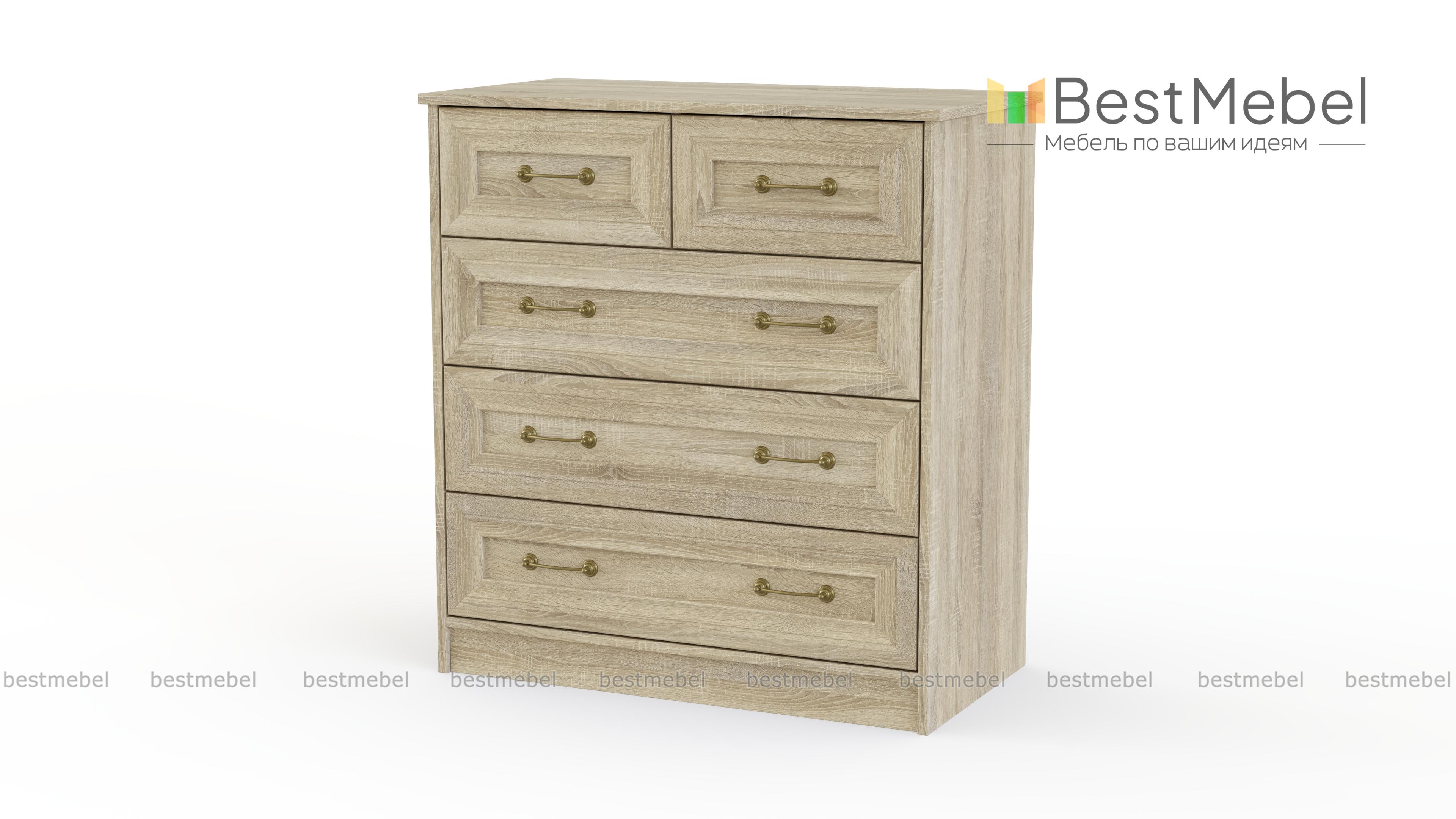 Красивая модель классического комода, изготовленного из современных материалов. Комод Ричард 0, 42 имеет три больших выдвижных ящика для постельного белья, домашних и личных вещей и два маленьких ящика для мелких предметов туалета. Особо привлекательно выглядят оригинальные стильные ручки, а поверхность комода можно декорировать различными предметами или использовать в качестве подставки под аппаратуру. Купить данную модель можно для гостиной, спальни, прихожей.