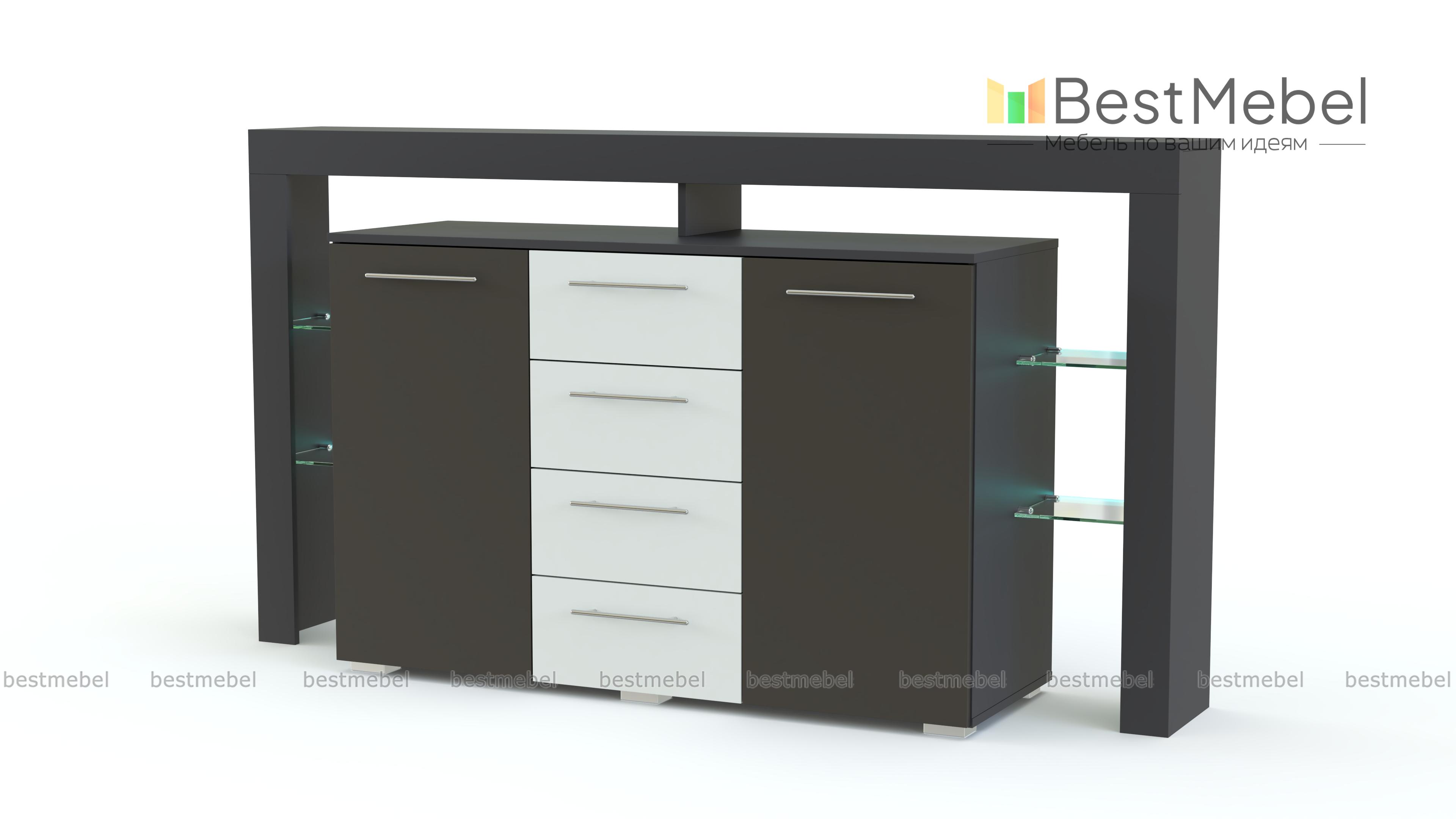 Футуристичный дизайн комода Riva II plus BMS станет идеальным дополнением современных интерьеров в стиле хай-тэк и минимализм. Четыре выдвижных ящика в центре располагаются по соседству с вместительными распашными отделениями и необычными, полностью открытыми стеклянными полками. Матовые фасады выполнены в контрастных цветах, фурнитура удобная и лаконичная, а светодиодное освещение придаст атмосферности не только предметам декора, но и гостиной в целом. Расцветку корпуса и фасадов вы сможете подобрать в нашем интернет-магазине.
