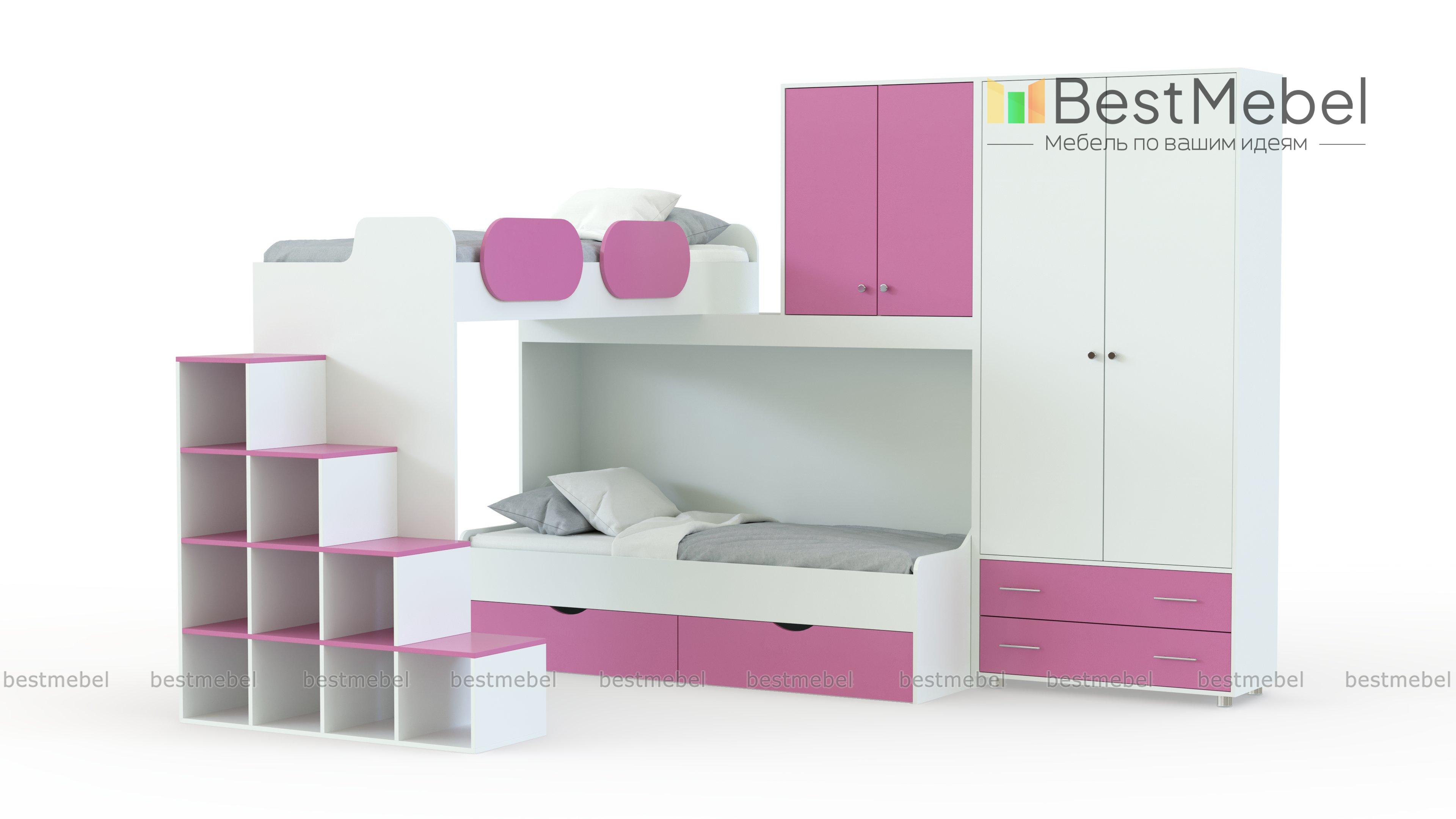 Детская Дельта BMS – современное яркое решение для комнаты на двоих детей. Продуманная конструкция поможет организовать комфортное для отдыха, игр и учебы пространство, а цветные элементы сделают атмосферу комнаты позитивной. В комплект входят лестница-стеллаж с вместительными открытыми полками, кровать с защитными бортиками и распашной шкафчик на втором ярусе, напольная кровать с выдвижными бельевыми ящиками и двухдверный шкаф для одежды. Купить детскую Дельта BMS по лучшей цене вы сможете в нашем интернет-магазине.