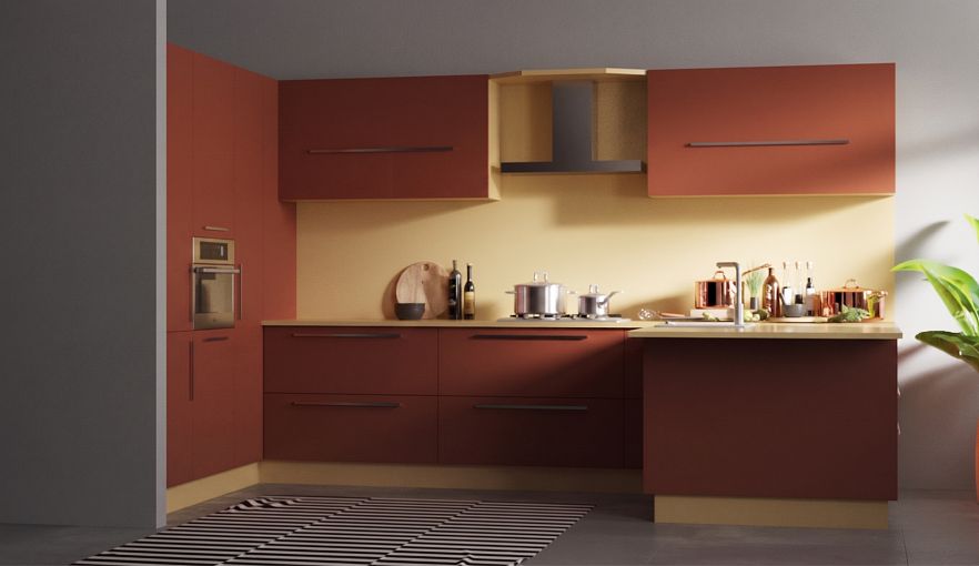 Кухня Оранж BMS выполнена в стиле хай-тек и займет одно из центральных мест в интерьере современной квартиры. Матовые фасады теплого терракотового оттенка сделает помещение визуально просторнее и подарят хозяевам и гостям дома хорошее настроение на весь день. П-образная композиция включает в себя пеналы под бытовую технику, напольные и навесные шкафы и барную стойку, которая станет практичной альтернативой обеденному столу. Купить кухню вы всегда сможете в нашем интернет-магазине, подобрав оптимальные параметры.
