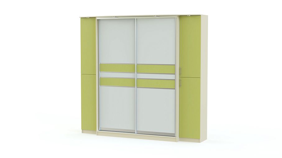 Современный и стильный шкаф-купе, который может похвастаться отличной вместительностью и большим количеством удобных отделений. Фасад изделия имеет яркие салатовые вставки, которые добавляют изделию изящности и оригинальности. Одной из главных особенностей представленной модели является удачно расположенная сверху подсветка, благодаря которой можно примерять вещи и смотреться в зеркало даже в тёмное время суток при недостаточном общем освещении.