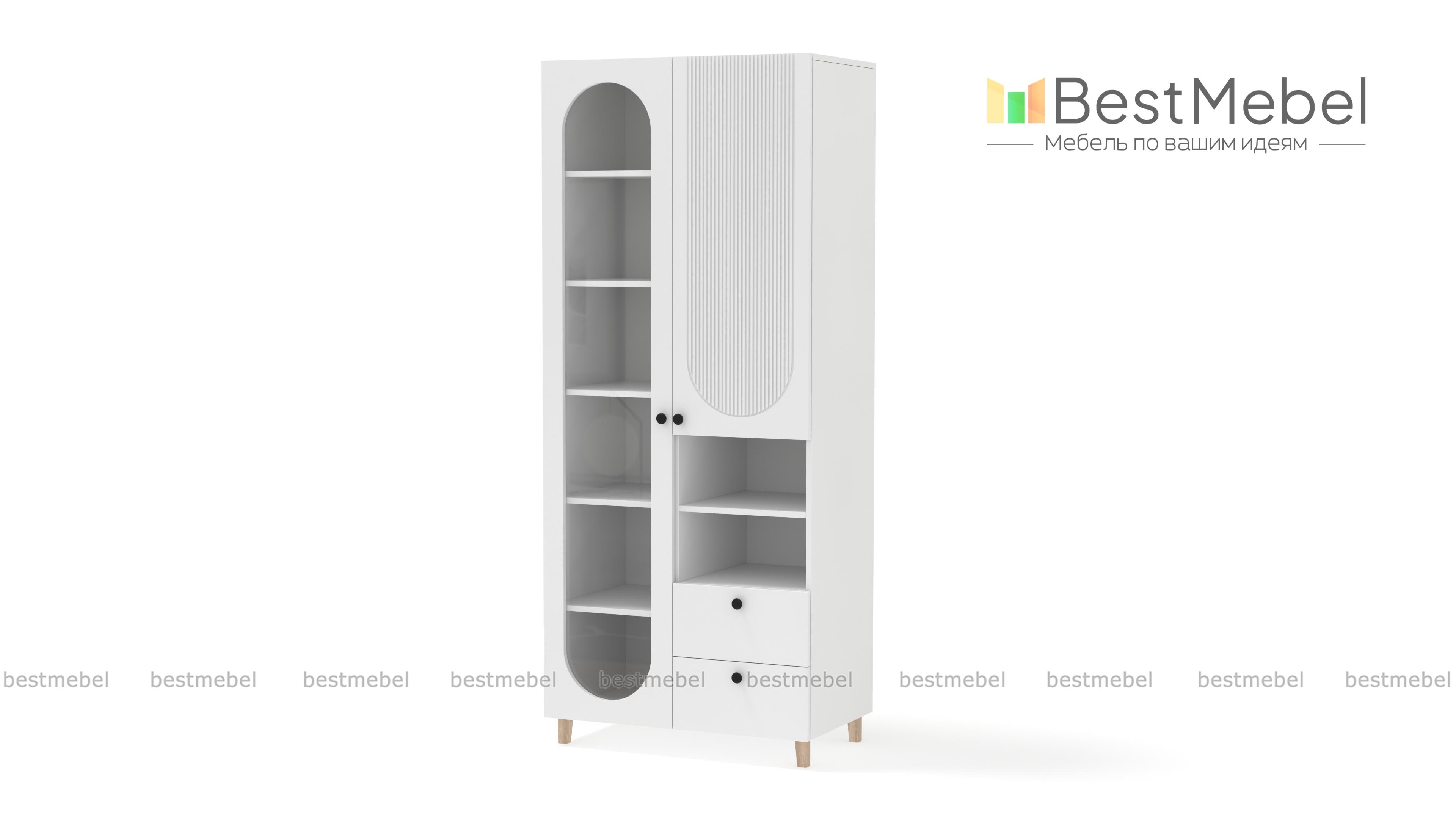 Шкаф распашной Рене 6 BMS с фактурным фасадом органично вписывается в пространство современной квартиры. Лаконичный силуэт с высокими ножками сочетается с оригинальным геометричным декором. Овальный вырез витрины слева дополняет закрытое отделение справа, секция с полкой для открытого хранения и два вместительных выдвижных ящика под мелкие вещи. Купить шкаф распашной Рене 6 BMS вы сможете в нашем интернет-магазине, подобрав размеры, цвет и фурнитуру.