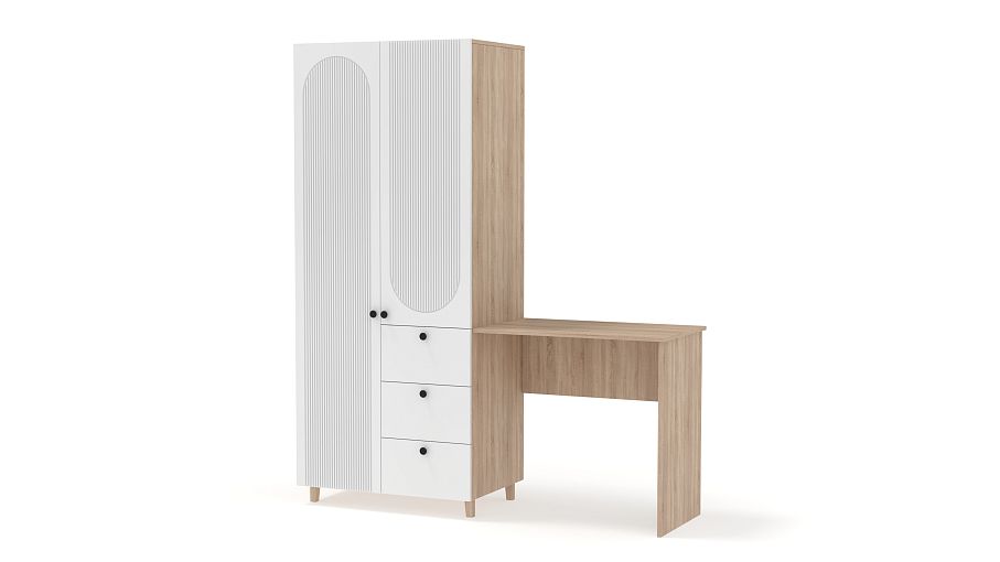 Шкаф со столом Рене 6 BMS объединил рабочую зону и удобную систему хранения. Элегантный гардероб с высокими ножками и фрезеровкой дополнен прямоугольным письменным столом справа. Для хранения вещей предусмотрены распашное отделение и ящики, а размеры столешницы позволяют разместить ноутбук, письменные принадлежности, материалы для творчества. Купить шкаф со столом Рене 6 BMS вы сможете в нашем интернет-магазине, подобрав размеры и наиболее подходящую цветовую гамму.