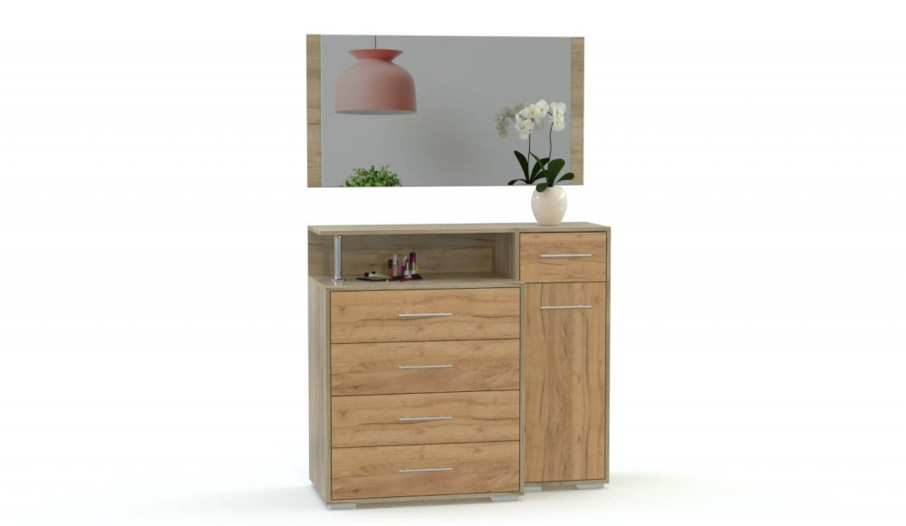 Выбрать оптимальное сочетание элементов и цветовое решение для вашей комнаты поможет модульный комплект для спальни Берта 2 BMS. Гарнитур состоит из четырехдверного шкафа с зеркалами в полный рост, дополненного угловой секцией - стеллажом, двуспальной кровати с оригинально декорированной спинкой, двух тумб и практичного комода с функцией туалетного столика. Стильный и современный вид придают ему лаконичная отделка и сочетание двух естественных древесных оттенков.