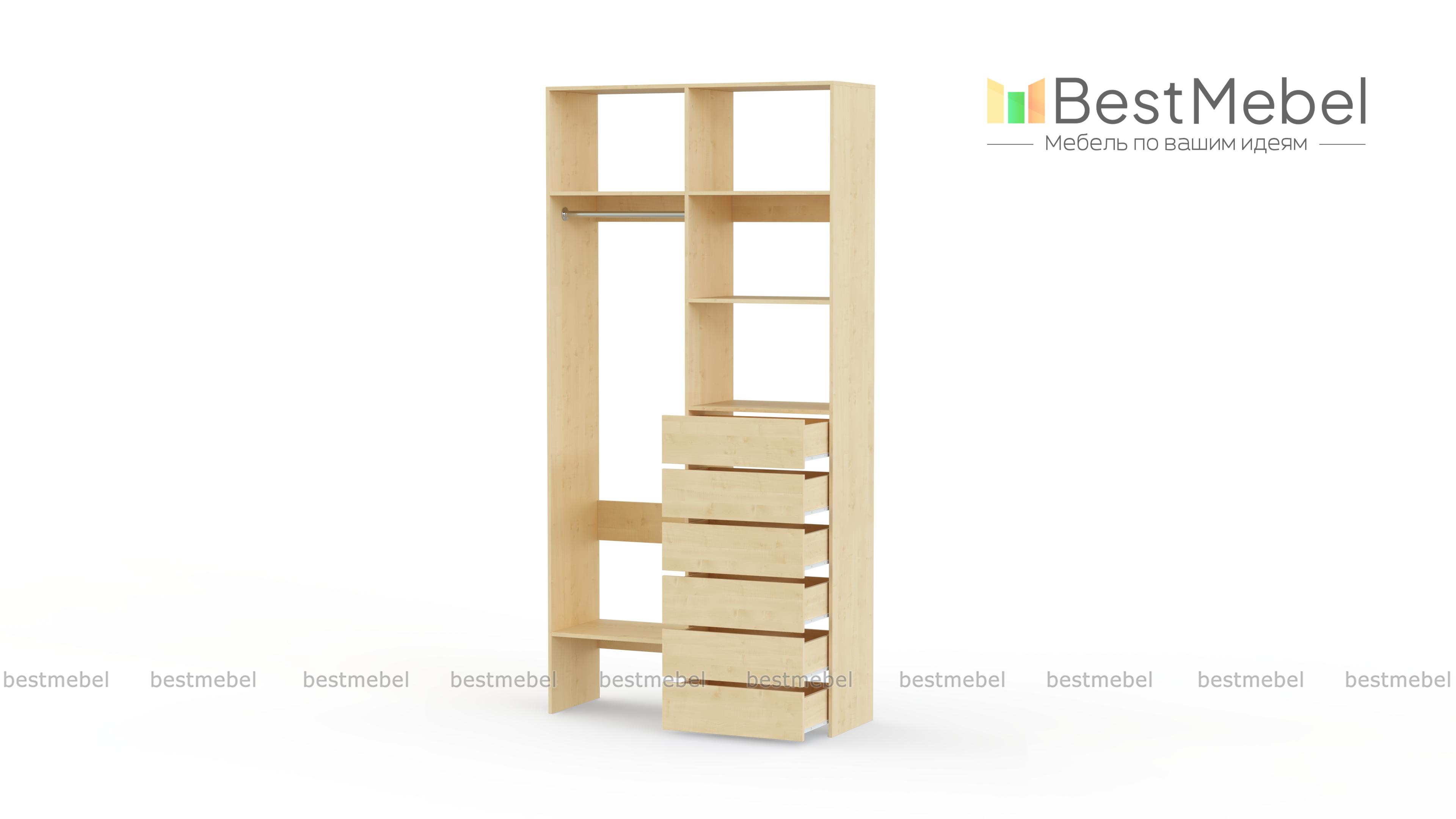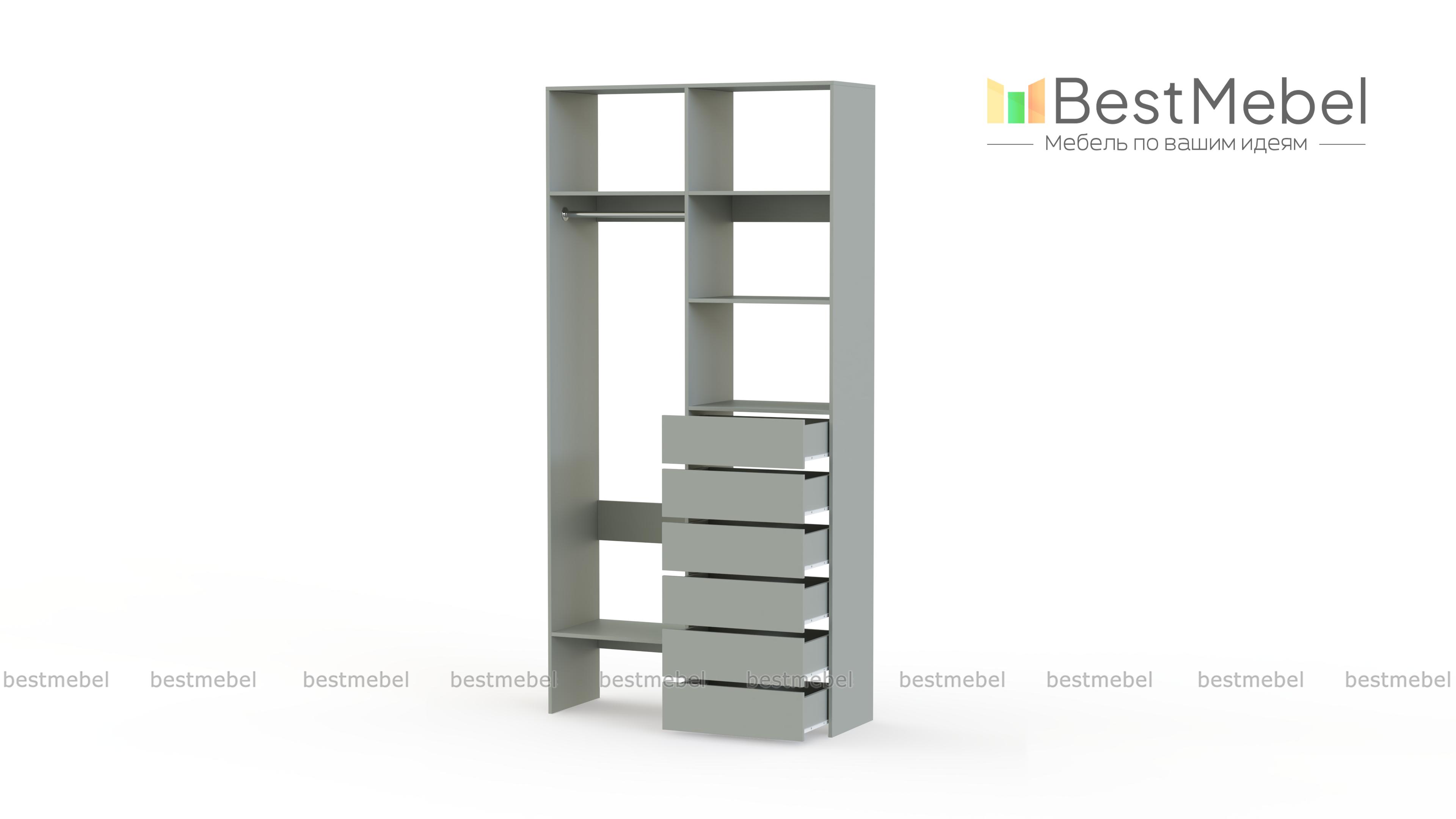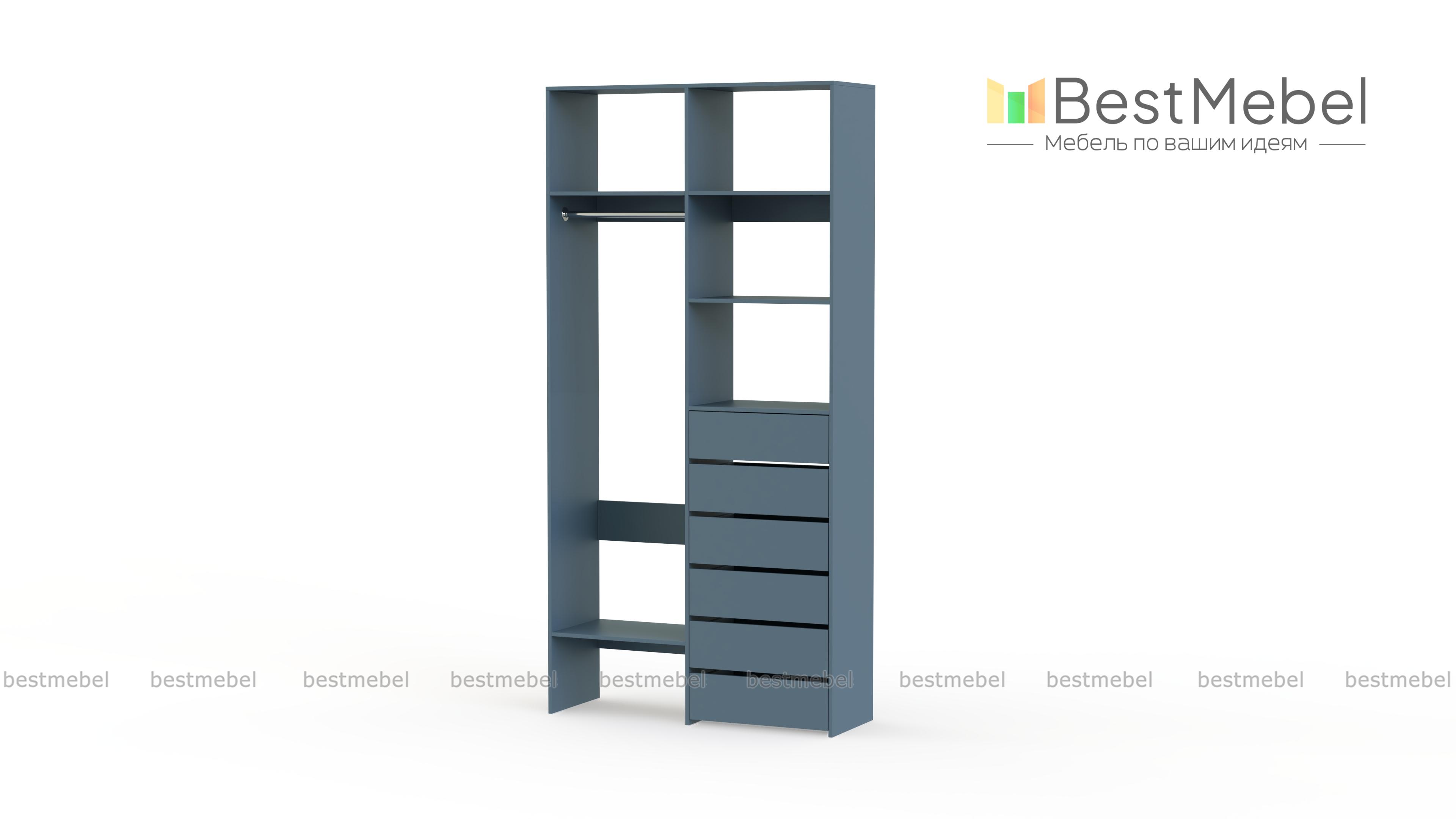 Стеллаж для одежды Мирта 38 BMS включает в себя разноплановые отделения для максимально удобного хранения. Платяное отделение слева и ряд из шести выдвижных ящиков справа дополнены вместительными бельевыми полками. Благодаря изготовлению из ламинированной ДСП стеллаж доступен по цене, прост в уходе и имеет широкую цветовую палитру. Купить стеллаж для одежды Мирта 38 BMS в необходимом вам размере и цвете вы всегда сможете на сайте нашего интернет-магазина.