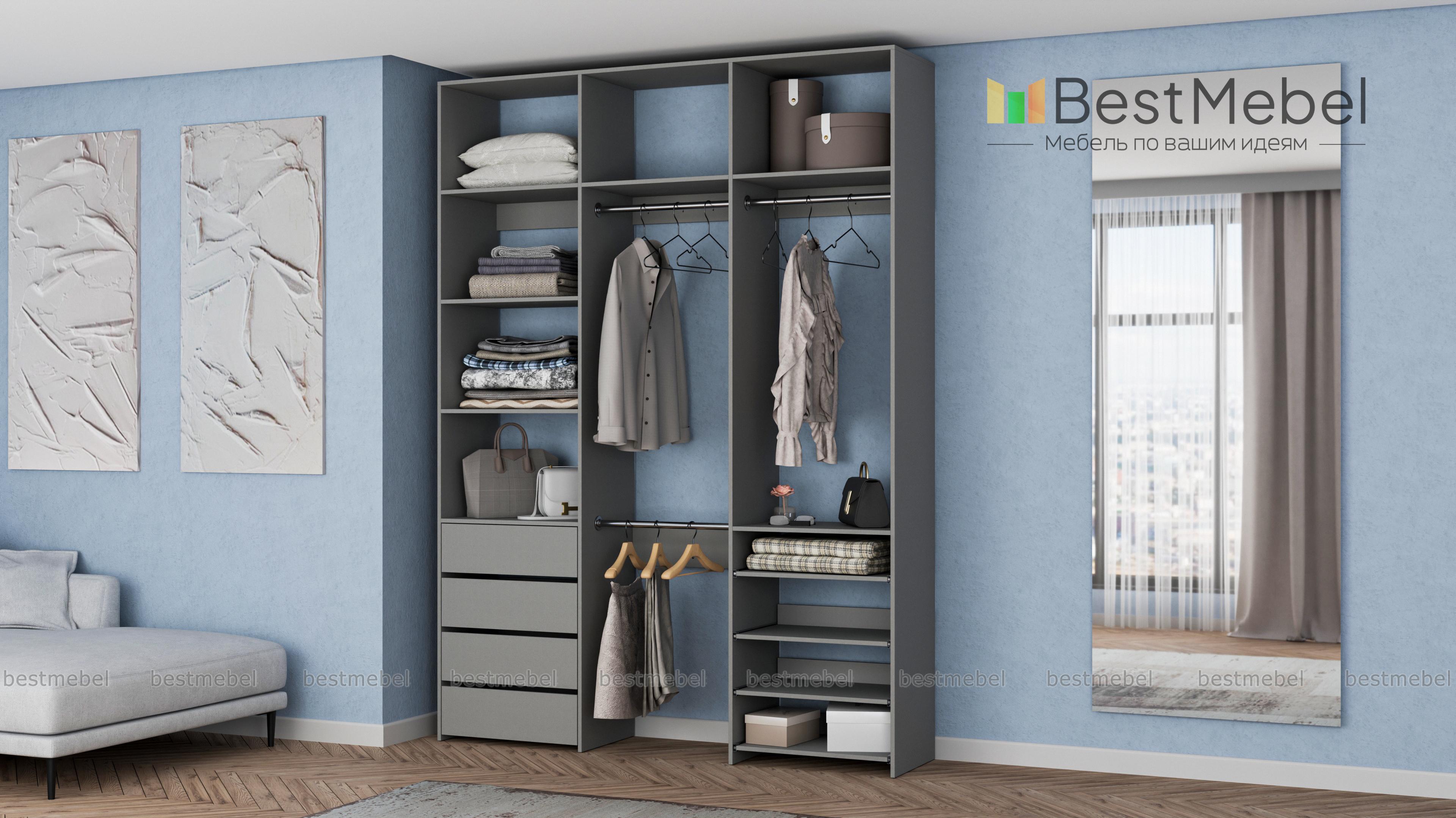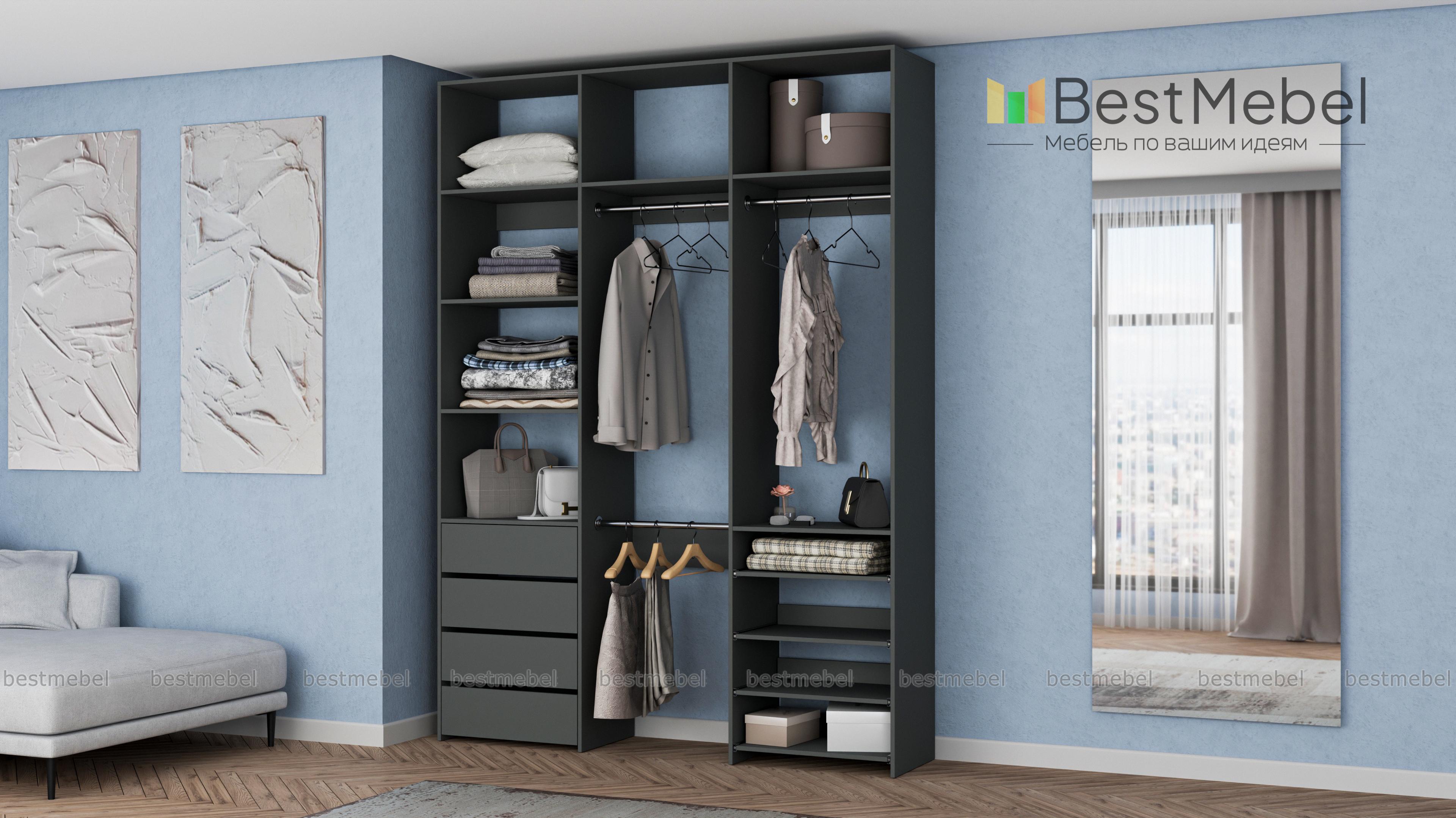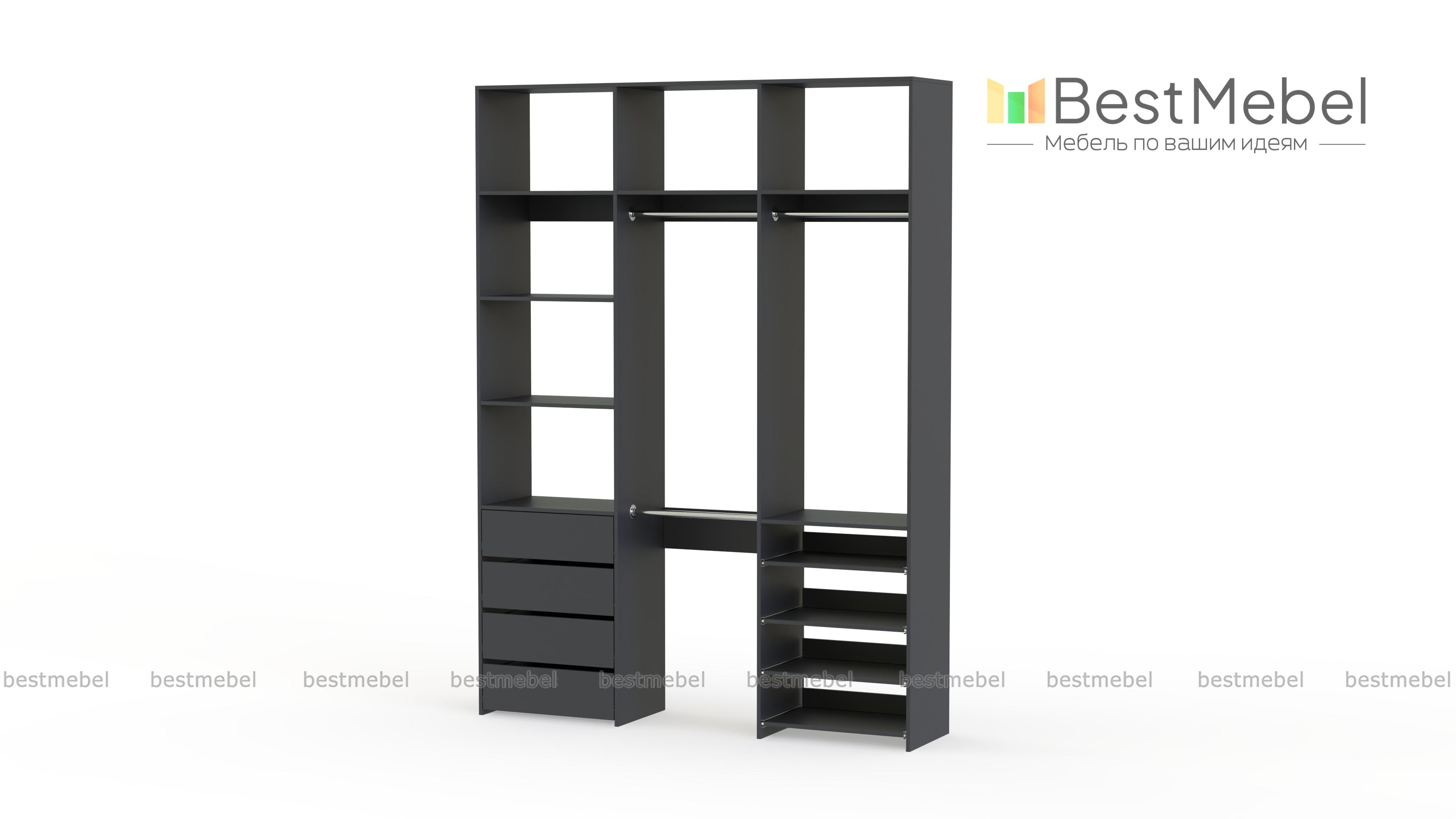 Стеллаж для одежды Мирта 88 BMS имеет открытую легкую конструкцию и универсальный дизайн. Комбинация трех штанг, бельевых отделений, ряда выдвижных ящиков и полок эффективно использует пространство вашей прихожей или гардеробной. Изготовленный из ламинированной ДСП высокого качества, стеллаж отличается прочностью и широким выбором цветовых решений. Купить стеллаж для одежды Мирта 88 BMS в гармонирующем с интерьером оттенке вы сможете на сайте нашего интернет-магазина.