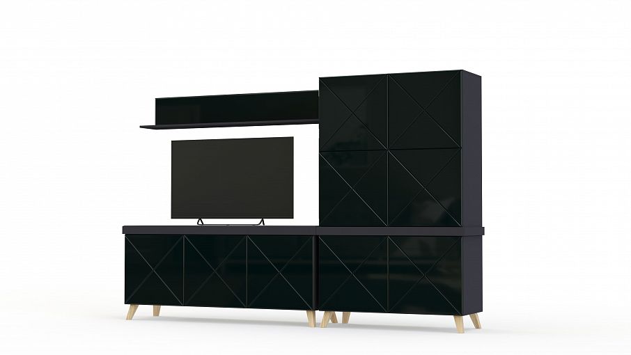 Стенка для гостиной Румба 2 BMS – это модульная мини-композиция, которая поможет вам нестандартно оформить зону ТВ. В комплекте широкая низкая тумба под ТВ и шкаф с распашными отделениями на высоких устойчивых опорах, а также навесная открытая полка для книг и декоративных мелочей. Особенно эффектный вид модулям, выполненным в черном цвете, придают глянцевые фасады с фрезеровкой. Купить стенку для гостиной Румба 2 BMS выгодно приглашаем на сайт нашего интернет-магазина.