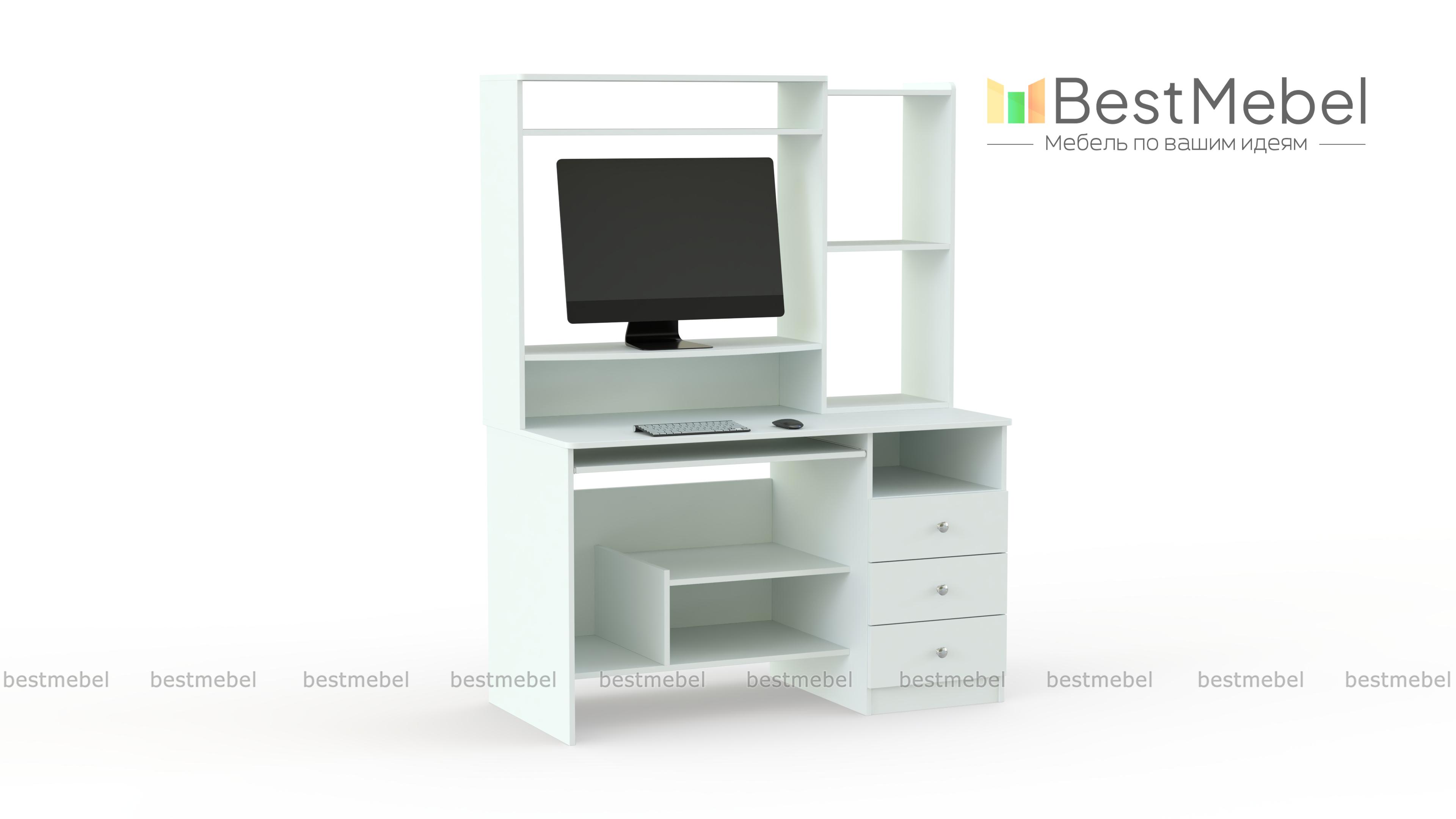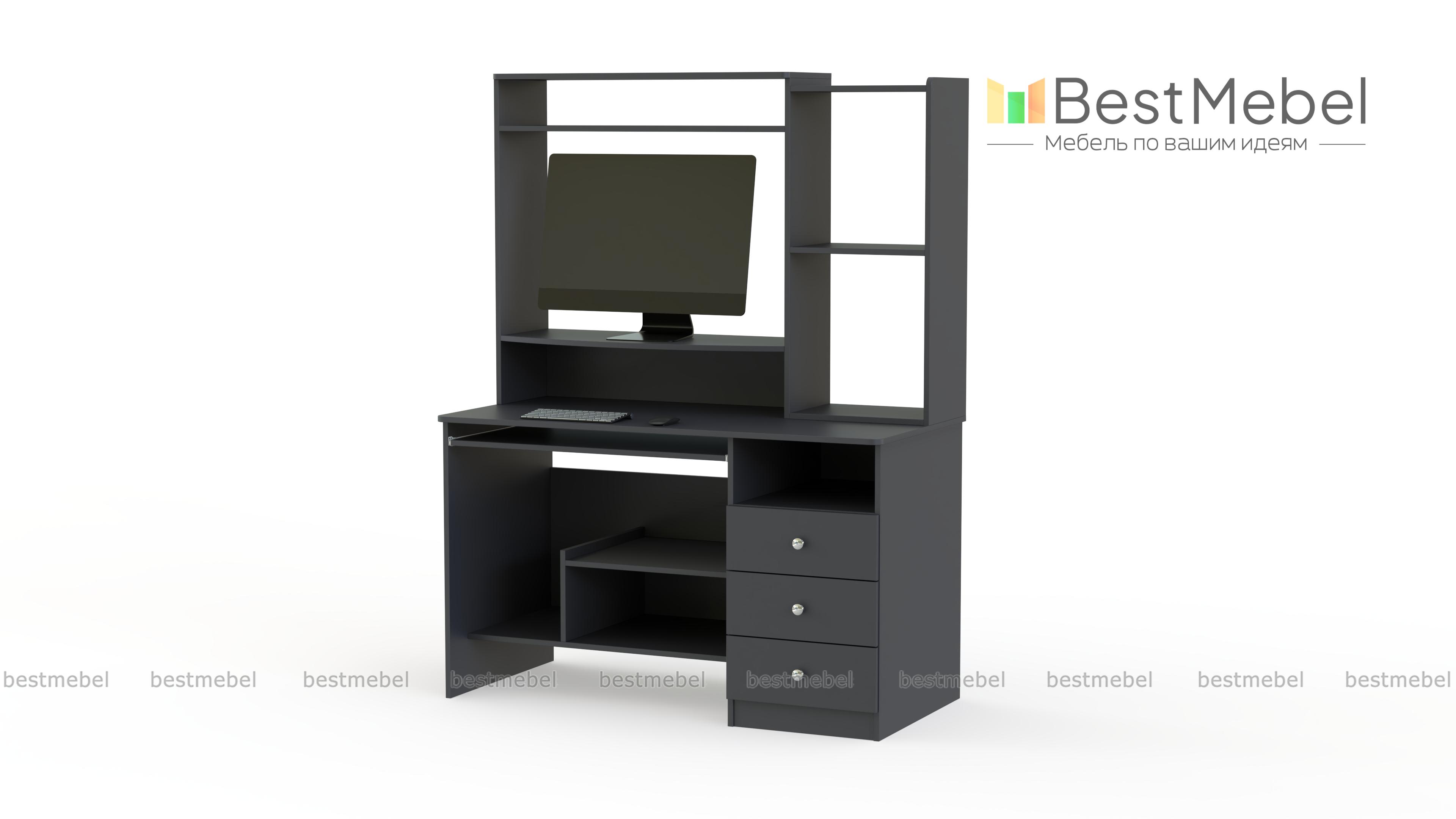 Добротный стол, с множеством функциональных мест, предназначен для комфортной работы за компьютером. Стол имеет специально отведенное место для компьютерного блока, монитора. Для клавиатуры имеется выдвигающаяся полка, в наличии вместительная тумбочка с 3 выдвижными и 1 открытым ящиком. В верхней части стола множество открытых полок для размещения всего необходимого и элементов декора. Купить стол Рома можно для детской комнаты, он будет исполнять роль письменного стола. Базовые размеры могут быть увеличены.