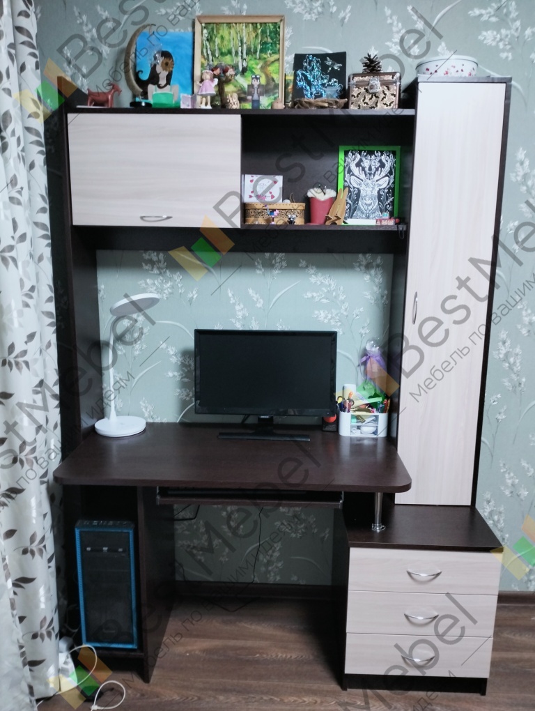 Симпатичный , аккуратный , удобный. Сделали быстро. На почту прислали эскиз .Добавили пару полочек по моему желанию .Правда забыли полку под клавиатуру , но обещали в ближайшее время привезти .Спасибо !