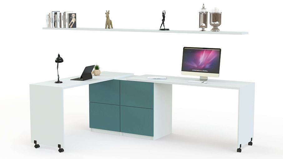 Угловой письменный стол для двоих Калифорния 8 BMS – это практичная модель-трансформер, незаменимая в интерьере комнаты современных школьников. Композиция, включающая в себя два письменных стола с колесными опорами, вместительную тумбу, оборудованную четырьмя выдвижными ящиками, и навесные книжные полки, позволит эффективно использовать пространство. Минималистичный дизайн стола подчеркивает сочетание белого корпуса и аквамаринового фасада. Купить угловой письменный стол для двоих Калифорния 8 BMS приглашаем в наш интернет-магазин.