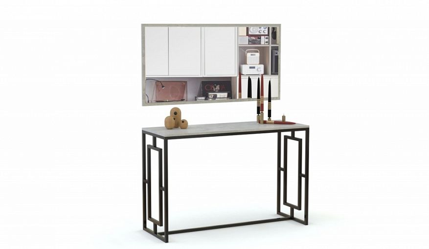 Туалетный стол Клора 13 BMS станет элементом дизайна лофта или актуального интерьера в индустриальном стиле. Просторная прямоугольная столешница с имитацией поверхности бетона располагается на фигурном металлическом каркасе, прочном и устойчивом. Вы сможете разместить под рукой все необходимые уходовые средства и предметы декора, а большое навесное зеркало с рамкой в тон столику крепится на любой удобной высоте. Купить туалетный стол Клора 13 BMS с учетом оптимальных размеров приглашаем в наш интернет-магазин.