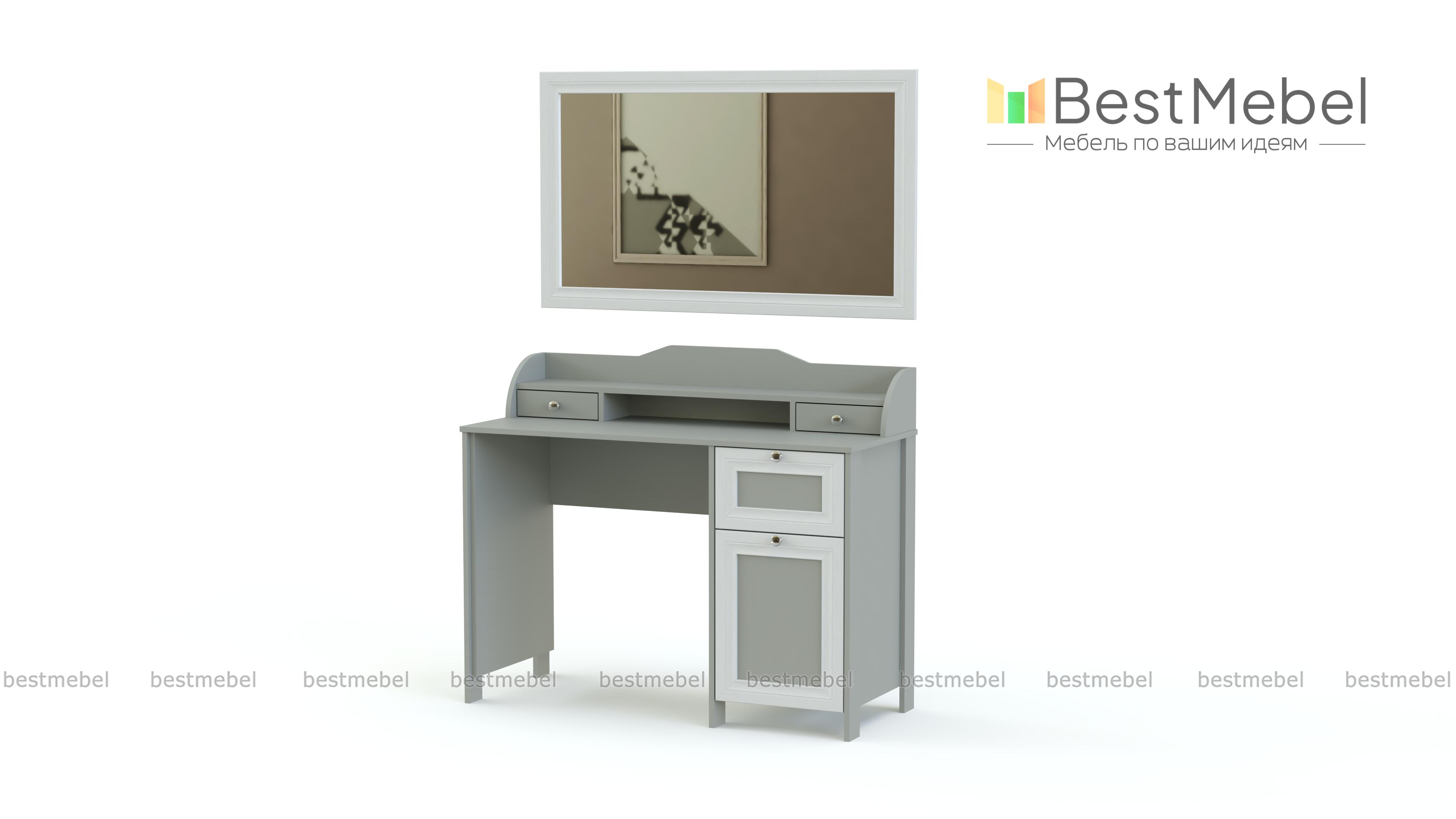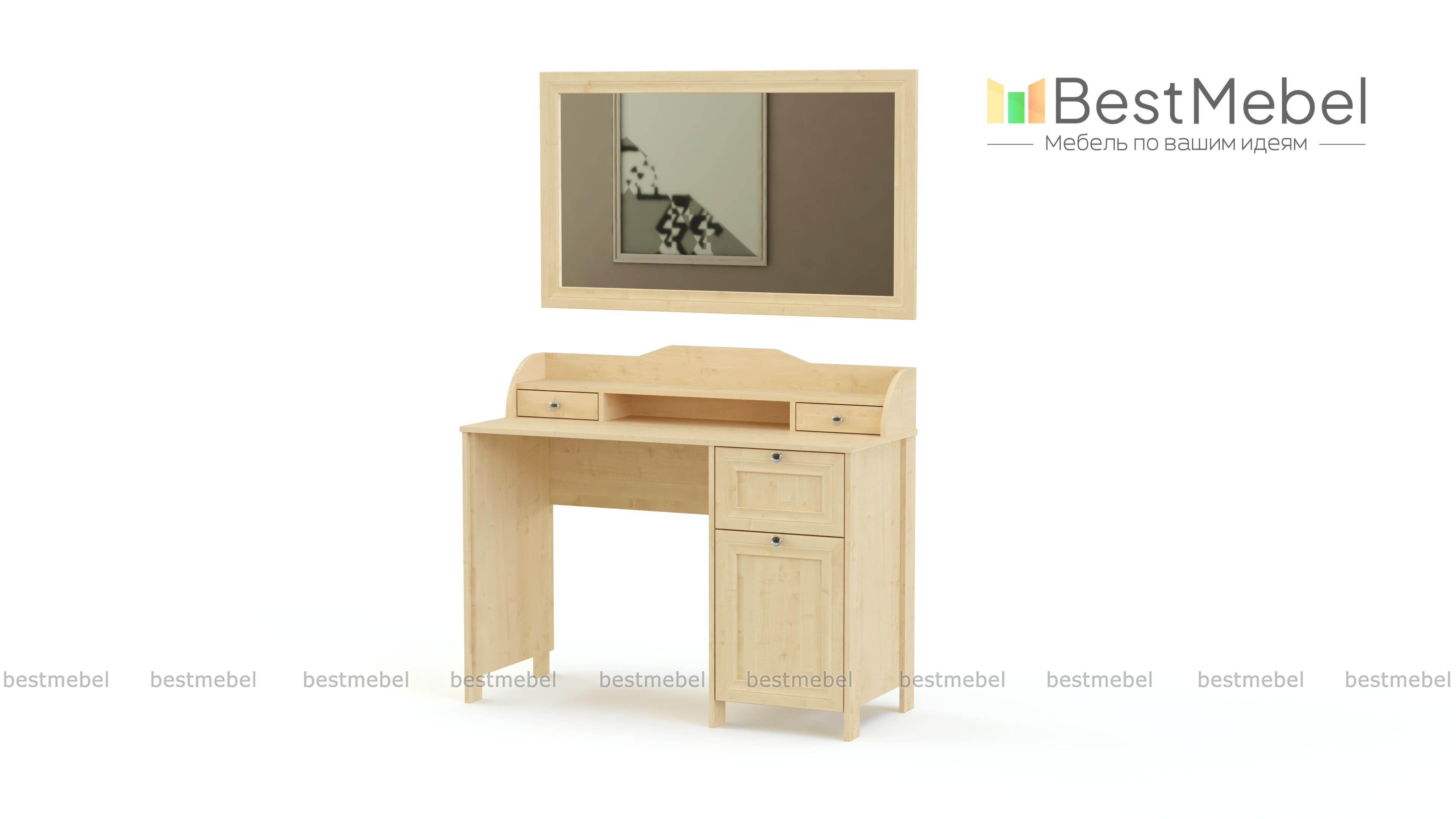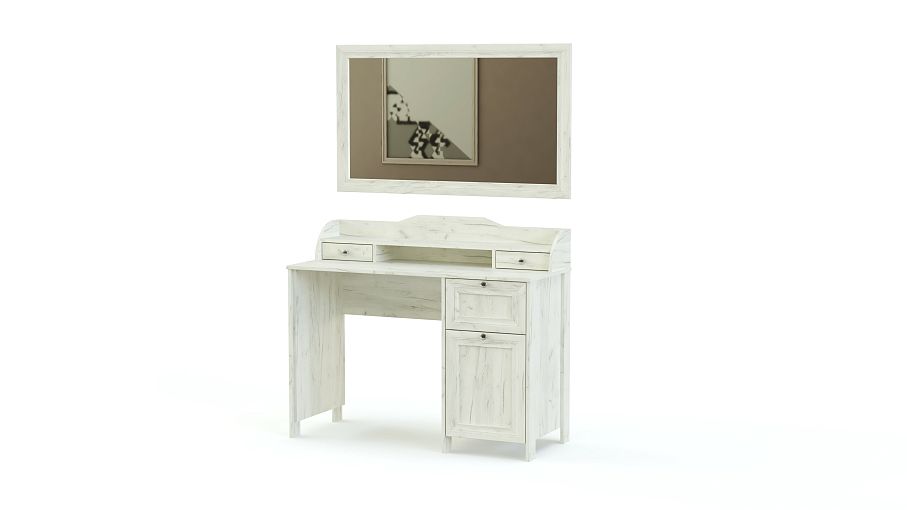 Туалетный столик Соната BMS украсит спальный интерьер и поможет разместить под рукой все необходимые уходовые средства и аксессуары. Изящная модель, выполненная в крафтовых древесных тонах, декорирована изящной рамкой и оснащена ручками-кнопками. Столик оборудован тумбой с выдвижным ящиком и распашным отделением и надстройкой с двумя ящичками и нишей, а дополняет композицию большое навесное зеркало. Купить туалетный столик Соната BMS для комнаты в стиле прованс, кантри или скандинавском вы сможете в нашем интернет-магазине.