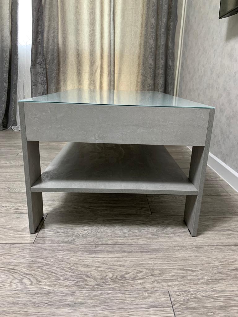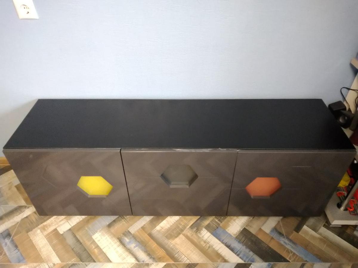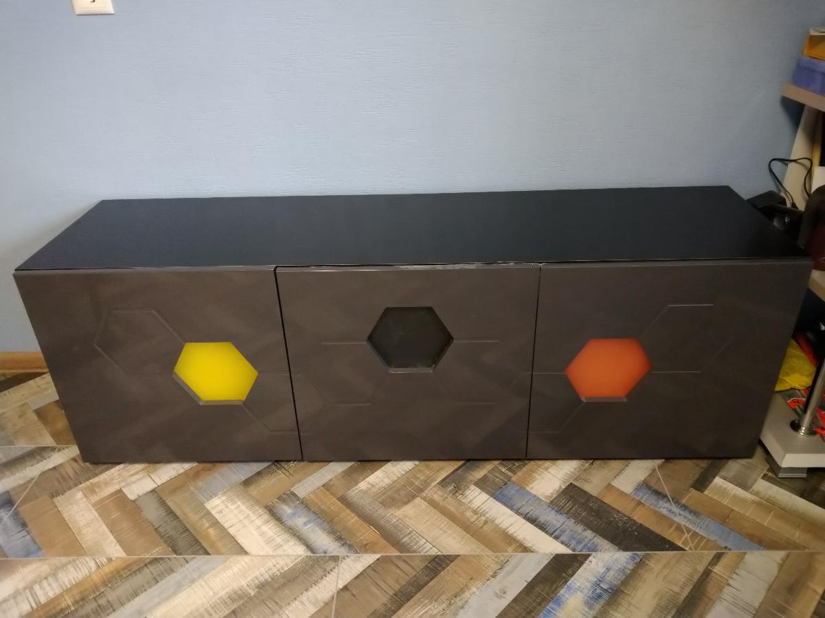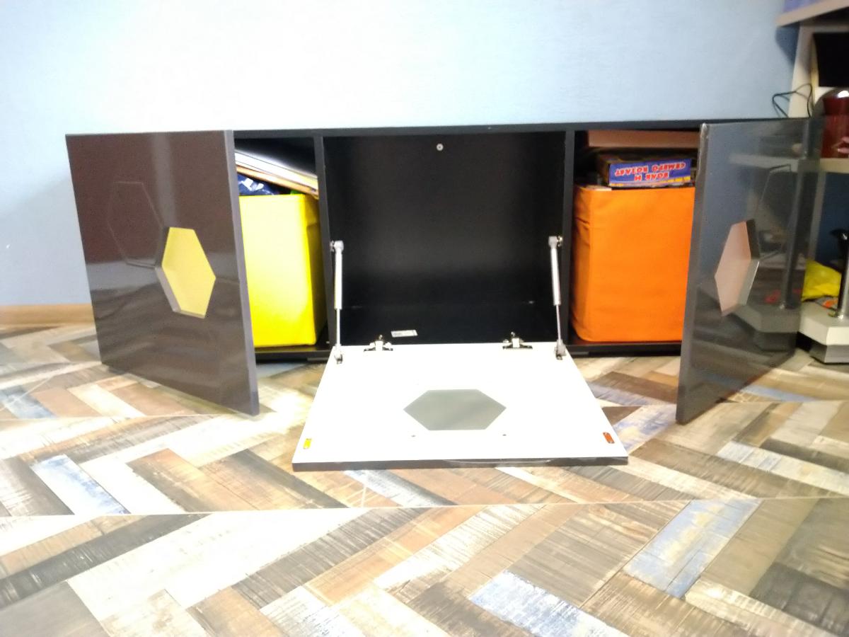 Отличная тумба темно-серого цвета (глянцевая), полностью соответствует описанию на сайте. Мы покупали тумбу с матовыми стеклами, но без подсветки, а также увеличивали высоту на 10см. Удобно, что средняя дверца откидывается вниз. За счет отсутствия внутренних полок тумба очень вместительная. Немного неэстетично сделаны крепления для стекол, но они внутри, поэтому нас это не сильно огорчило. Зато при желании на стекла можно наклеить пленку любого цвета и будет эффект подсветки. Доставили строго в срок, при том, что мы увеличивали стандартный размер.