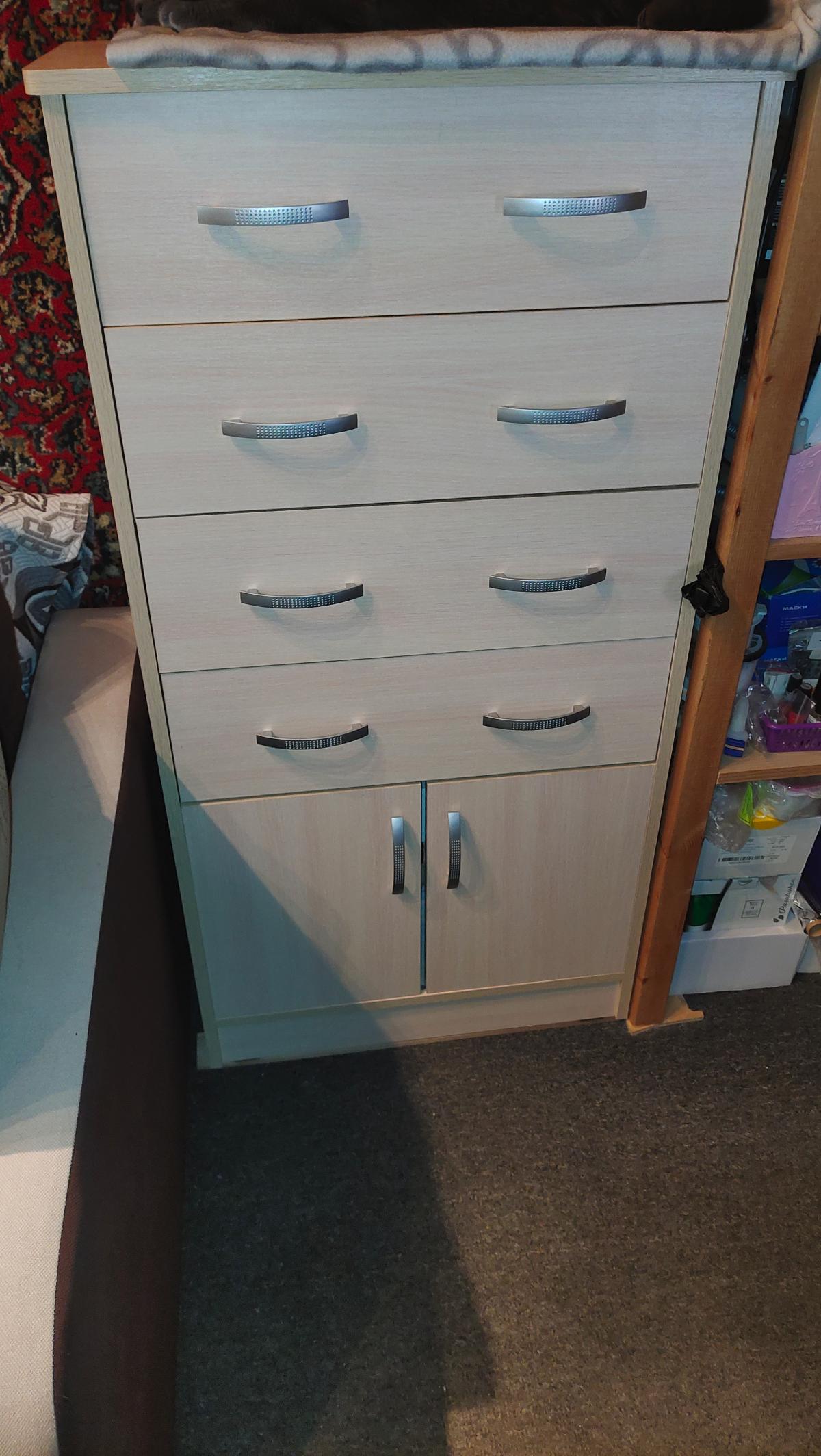 Покупал комод по нужным для себя размерам. Заказ 00000627172, изделие Комод Ричард 2.4 BMS (600х1150х300). Хороший, удобный комод. Качество изготовления хорошее. Собирал сам. Все отверстия и прорези сделаны точно. Если есть опыт сборки, то собрать самому не составит труда. Фурнитура с запасом даётся(много саморезов осталось)