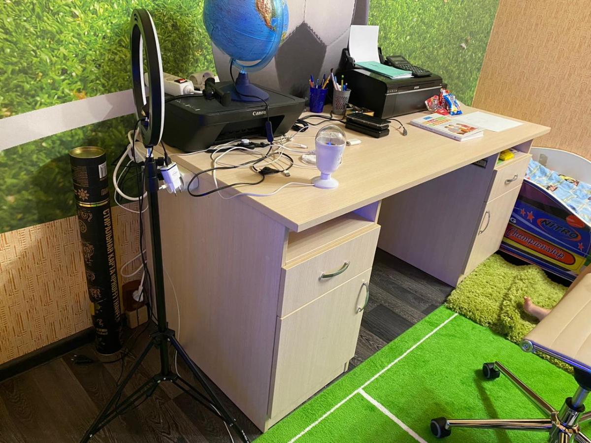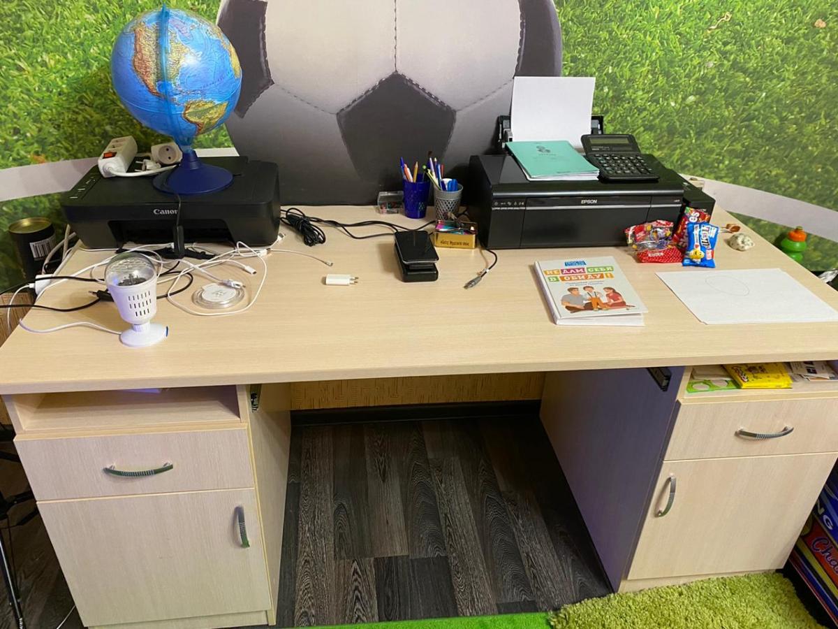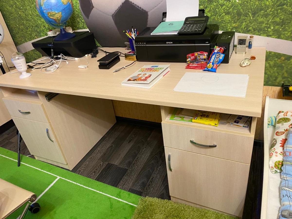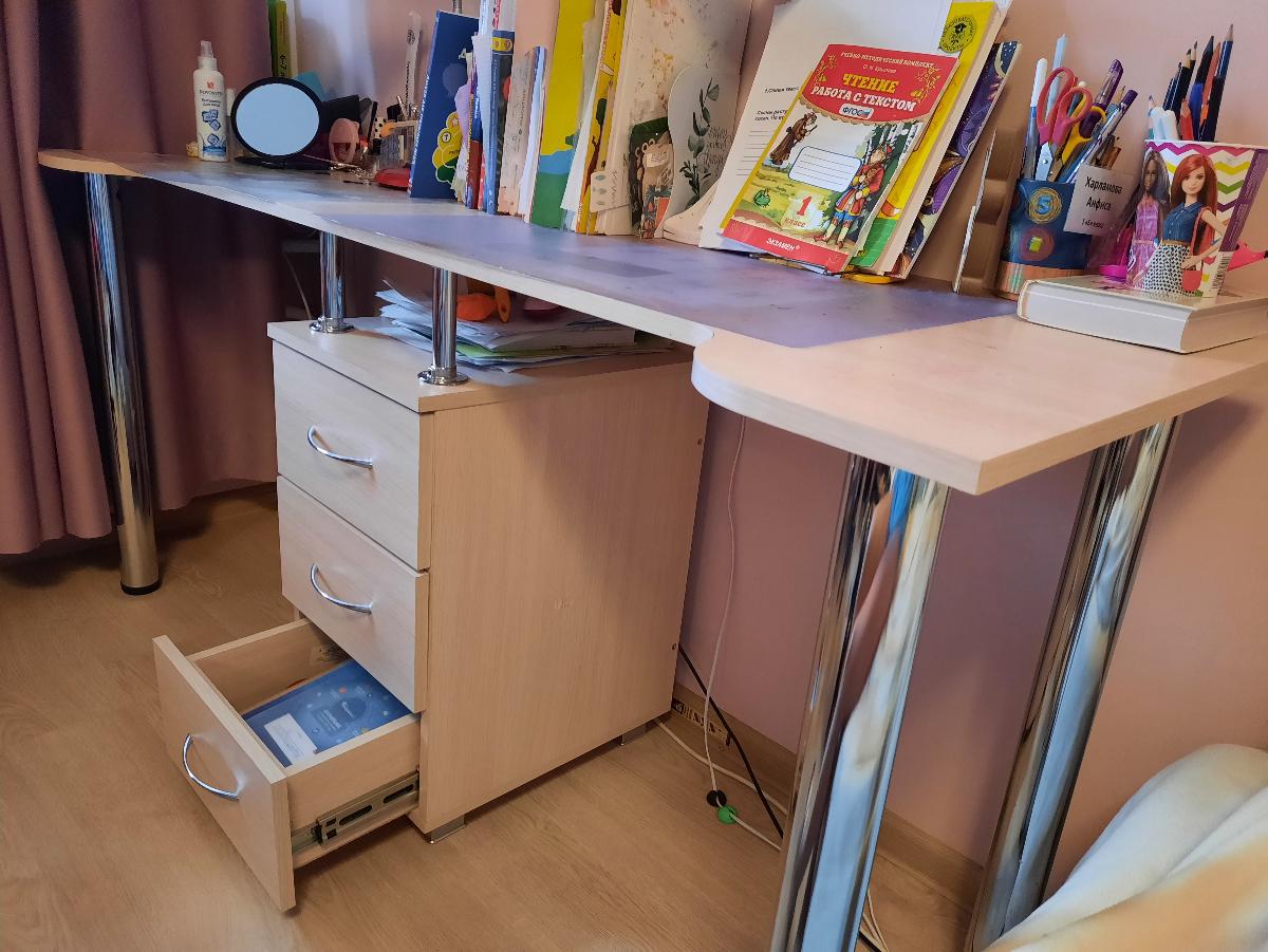 Очень стильный, удобный, негромоздкий, и не выглядящий офисным стол для двух школьниц. Прекрасно вписался в интерьер, не хватает только прорезей для кабелей в столешнице. Одной тумбочки вполне хватает.  Удобные доводчики в ящиках. Не терпит влаги - кот разлил воду, не заметили, столешница вздулась, отошла на закруглении. Обязательно использовать накладки.