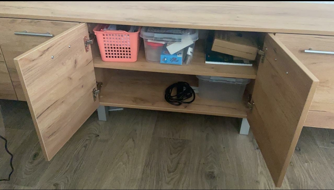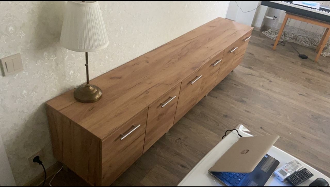 Отличная тумба, приятный современный вид,  цвет выбрали золотой крафт, смотрится прекрасно, отдельно докупались ножки хром в цвет ручек, чтобы влажную уборку делать, но можно было и подвесить. На тумбу кладу ноутбук, сумки гостей, фрукты/десерты, много чего, внутрь вмещается много контейнеров с всякой всячиной: книги, нитки, лекарства и пр. Я на неё сажусь иногда, выдерживает (по этой причине не хотели подвешивать).  Размер тумбы на фото: 220 × 44× 40 см. Рекомендую!