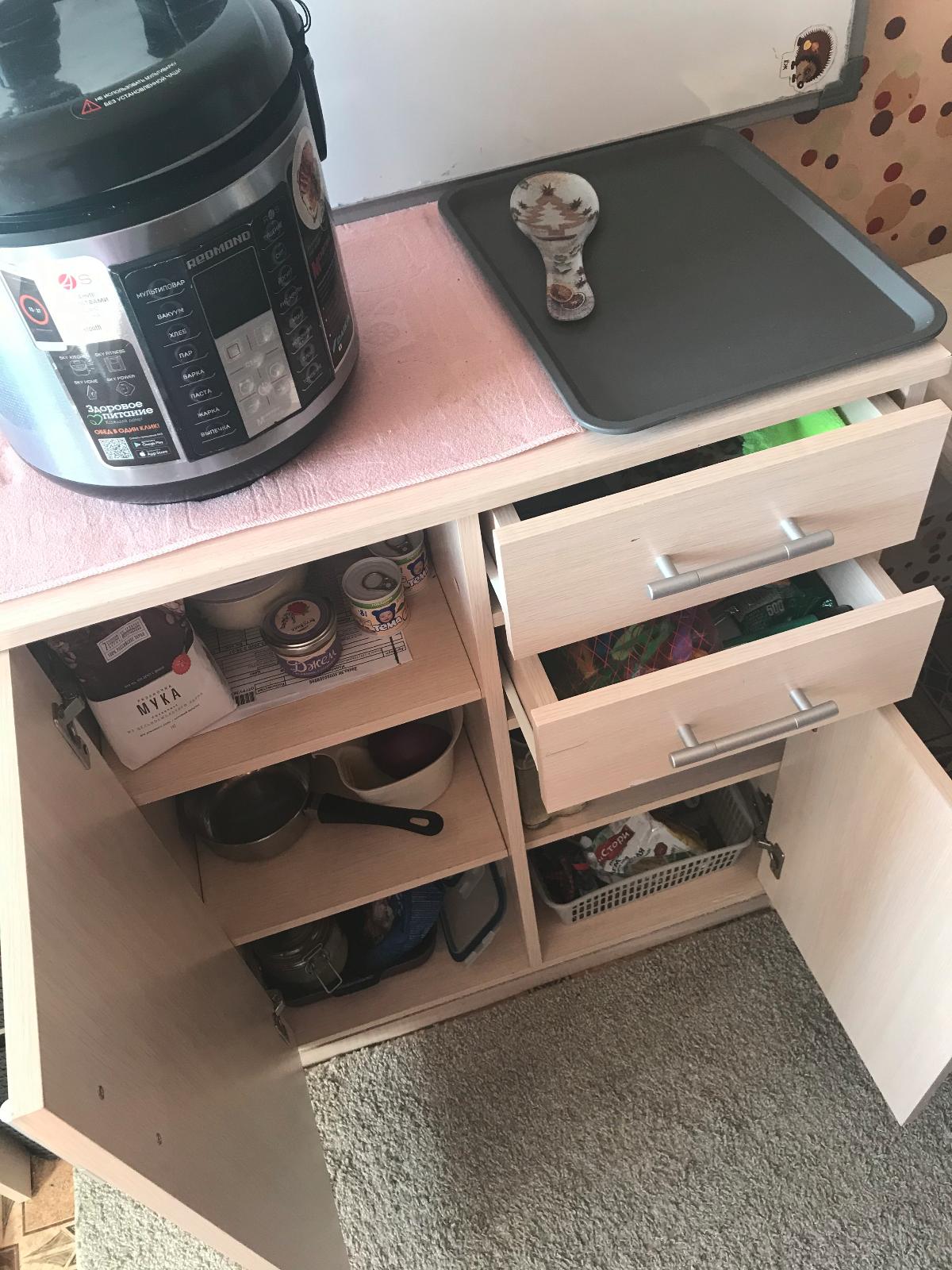Заказ 00000369096 от 06.03.2020. Заказали этот комодик в марте 2020, фото сделаны в конце июля, мы всем очень довольны! Приносит радость. Очень приятно, что можно выбирать свои размеры! Нам нужно было на кухню под мультиварку. Глубина 40 см - просто отлично для маленькой кухни. При этом высоту попросили побольше 94 см, то, что надо! Получилась очень удобная станция)))) И шкафчики очень удобные, все функционально. Отдельно приятно, что можно было выбрать цвет и модель ручек. Материал приятный на ощупь, гладкие фасады)). Глаз радуется, все довольны! Спасибо большое!