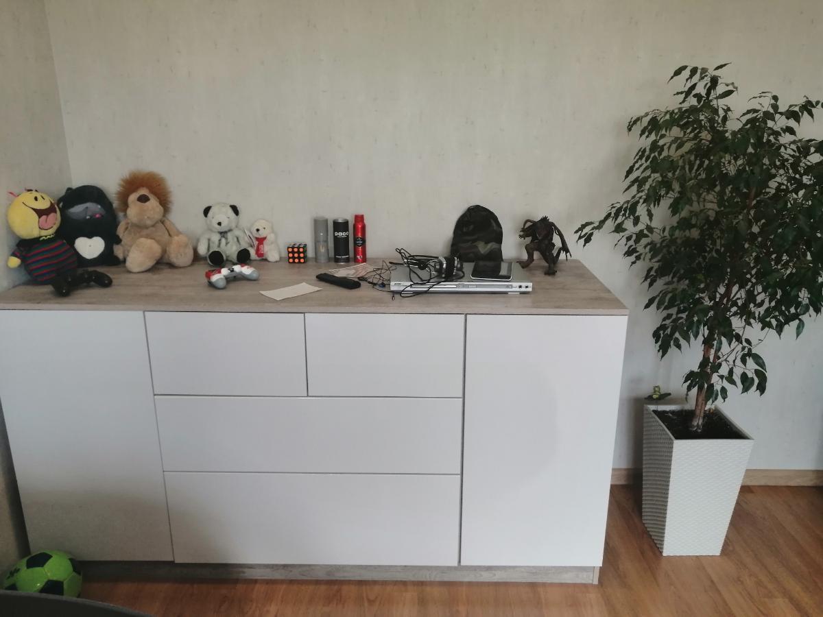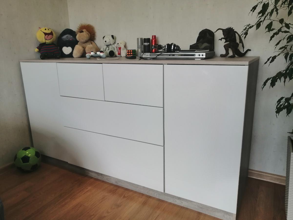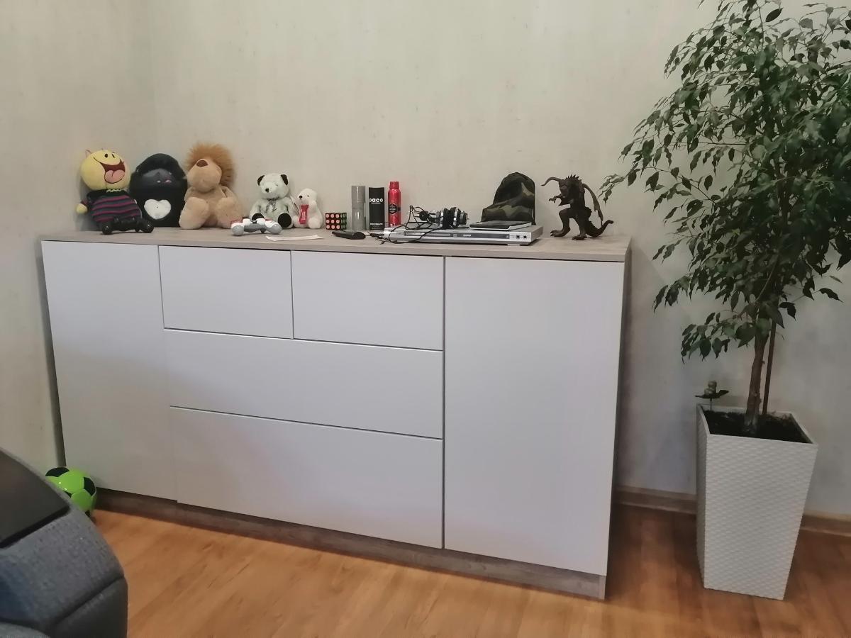 Класный комод, качество порадовало, смотрится очень здорово. Ширина: 1804; Высота: 932;  Глубина: 600; Цвет корпуса: Боб пайн; Цвет фасадов МДФ: Белый металлик Глянец 9509