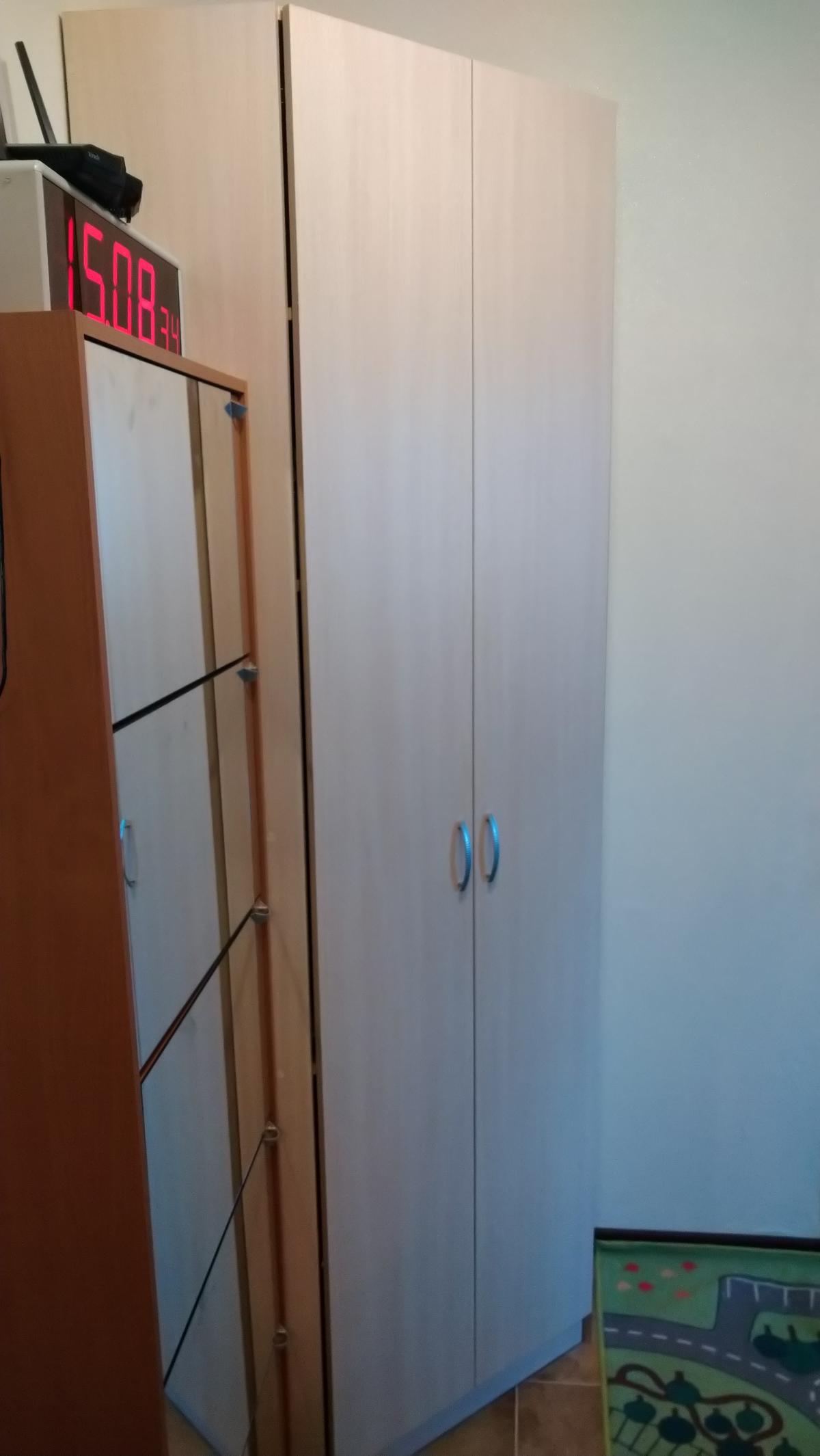 Шкаф нас удивил. Он оказался длинным и тонким (НЕ таким широким и коротким как на ваших картинках). Матового стекла в нем тоже нет. Он весь деревянный (или что там за материал). Мы думали хранить в нем папки, но они, конечно же, НЕ везли. В итоге мы приспособили его под детские вещи и, в целом, довольны. Смотрится стильно, как видите на фото (сверху лежит рамочка, не обращайте внимания). Убираться очень удобно, когда мебель висит. Благодаря вашей компании столы у нас тоже навесные и мы счастливы)
