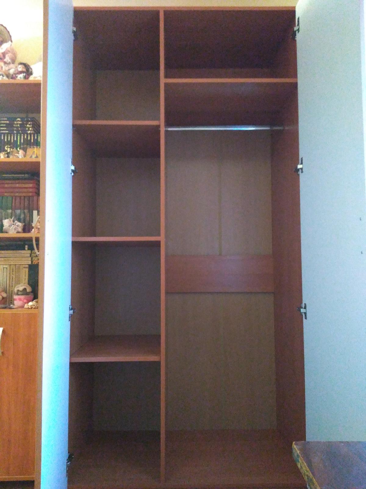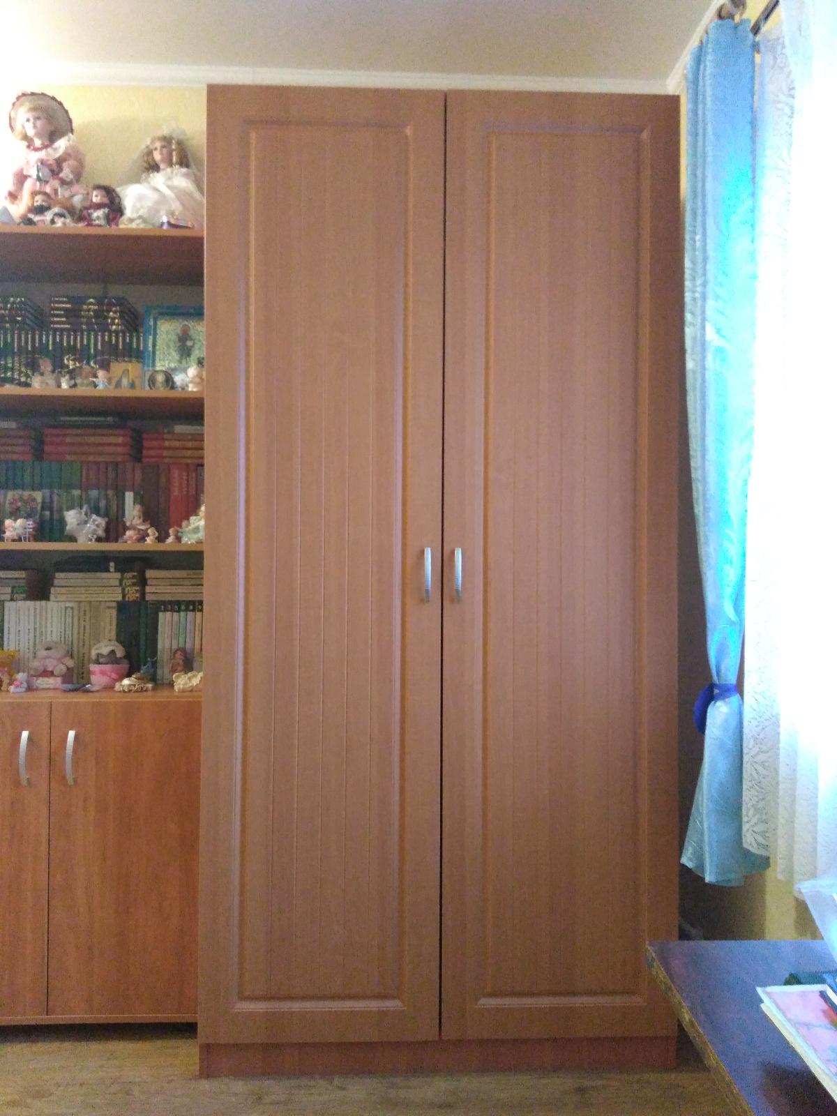 У моего шкафа следующие характеристики:Компоновка шкафа: Белье - Платье (3 полки) (2)Ширина: 1м., делится в отношении 40-60 см., двери по 50 см.Цвет корпуса: Ольха ГорскаяЦвет фасадов МДФ: Ольха 1072Впервые собирала шкаф, но справилась. Инструкция не особо понятная, но можно самой понять, что куда.Оргалит (заднюю стенку) прикрепила мебельным степлером.Единственное пожелание к производителю - кладите пожалуйста запасной ключ для сборки. Я на том ключе, что был в комплекте, сорвала резьбу примерно в середине работы.